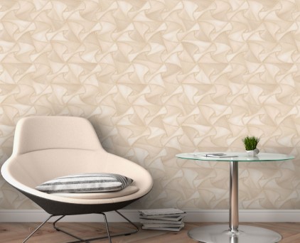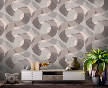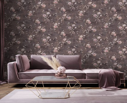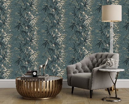 Фоновые обои нельзя обозначить как какой-то конкретный узор. Здесь можно увидеть и хаотичное движение холодных потоков воды, и срезы камня, и очертания скалистых берегов, и плотный туман на рассвете. На таком сложном базовом рисунке на декоративных полотнах добавлены ветки растений. Сами флористические элементы двух цветов, но с добавлением минимального количества серебряных блесток. Такой сложный минимализм, при правильном подборе мебели и акцентных аксессуаров, может создать интерьер в стиле не только модерн, но и романтизма.